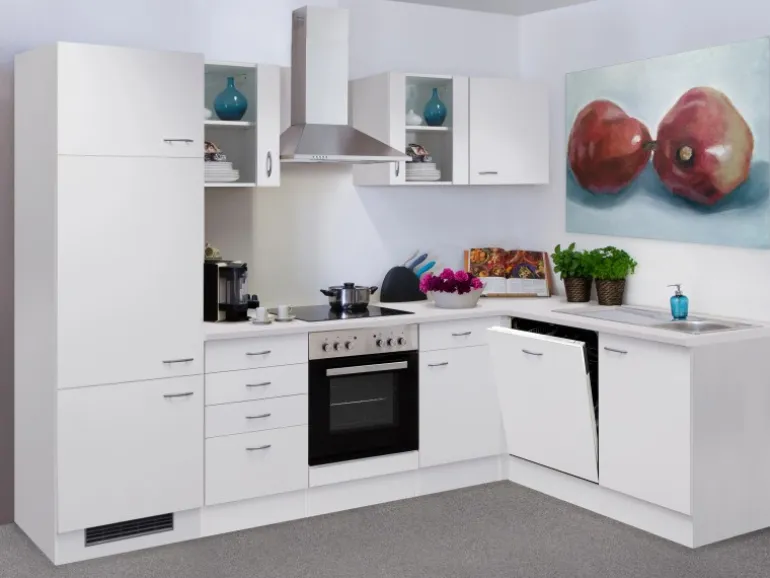 Drei Hängeschränke mit je einem Einlegeboden bieten reichlich Platz für Geschirr und Gläser. In dem Eck-Unterschrank und dem Unterschrank mit drei Schubkästen sowie einem Auszug finden Besteck, Töpfe und/oder Vorräte ihren Platz. Auch im hohen Geräteumbauschrank mit Kühlschranknische und drei Drehtüren sowie dem Spülenunterschrank mit eingebauter Edelstahlspüle steht genügend Fläche zur Verfügung, um noch mancherlei Küchen- und Putzutensil zu verstauen. Bei Bedarf können Sie Ihre Küche einfach mit weiteren Schränken aus der Serie ausbauen.