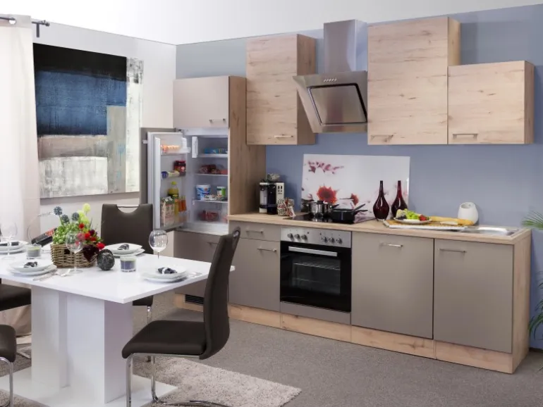 Neben mehreren Oberschränken bieten Unterschränke, ein hoher Geräteumbauschrank sowie Schubkästen reichlich Platz für Ihre Küchenutensilien. Und wenn es wirklich einmal mehr werden sollte, können Sie Ihre Küche einfach mit weiteren Schränken aus der Serie erweitern.