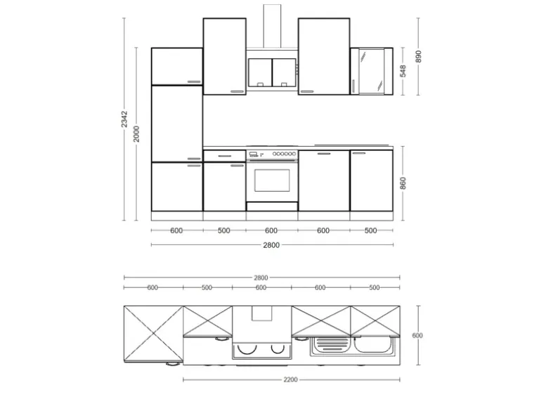 Die 310 cm breite Küchenzeile besteht aus (BxHxT):
