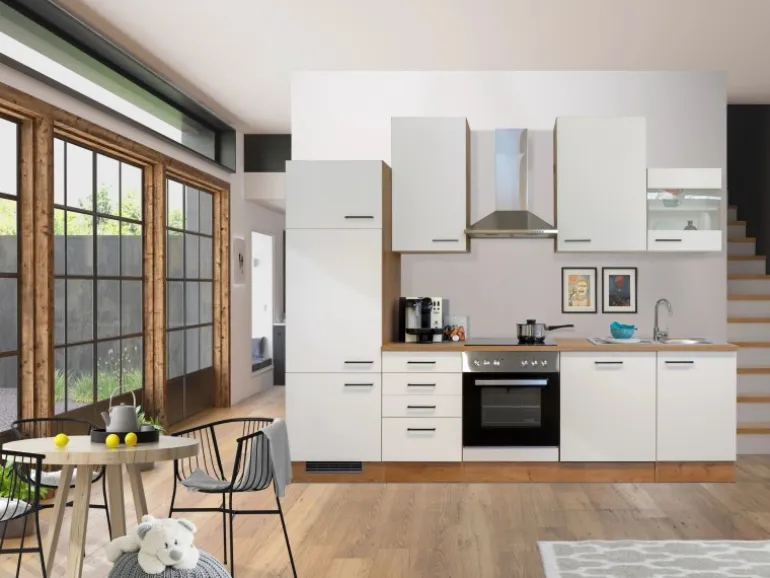 Die 280 cm breite Küchenzeile (B x H x T) besteht aus: