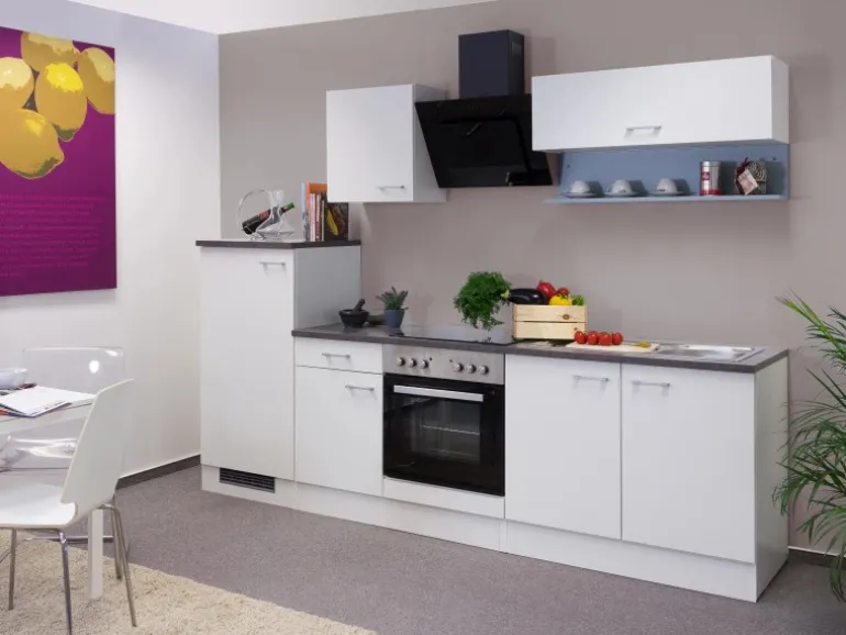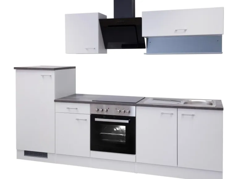 Ein 50 cm breiter Oberschrank mit Einlegeboden und ein 100 cm breiter Klappenschrank mit Gasdruckfeder bieten reichlich Platz für Geschirr und Gläser. Im Unterschrank mit einem Schubkasten, einem Einlegeboden und einer Drehtür finden Besteck, Töpfe und/oder Vorräte ihren Platz. Auch im geräumigen Spülenunterschrank mit eingebauter 86 cm großer Edelstahl-Einbauspüle lässt sich noch manches Küchen- und Putzutensil problemlos unterbringen. Und wenn es wirklich einmal mehr werden sollte, können Sie Ihre Küche einfach mit weiteren Schränken aus der Serie erweitern.