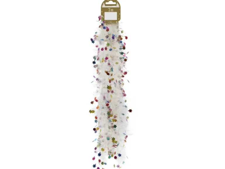 Mit weißen Kunststoff-Federn und bunten Folien-Sternen
