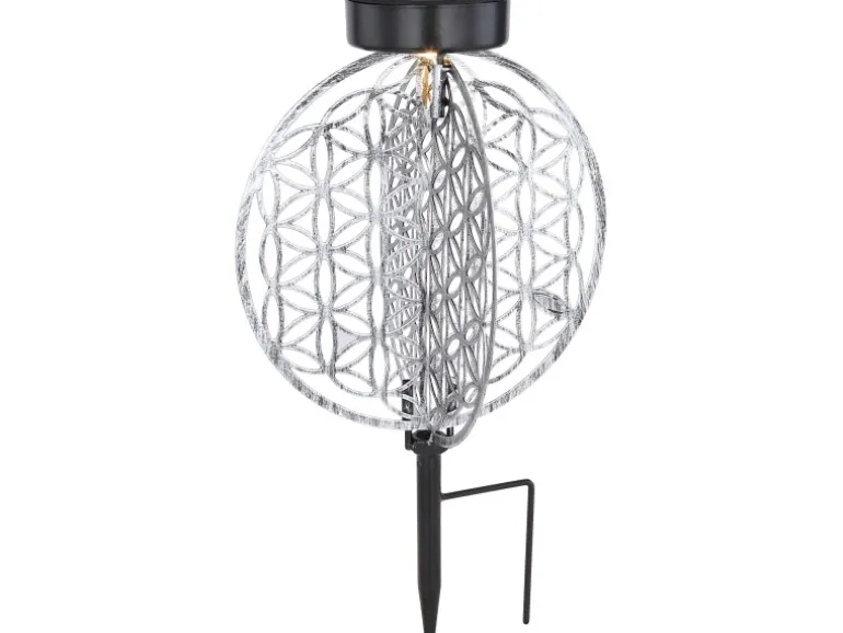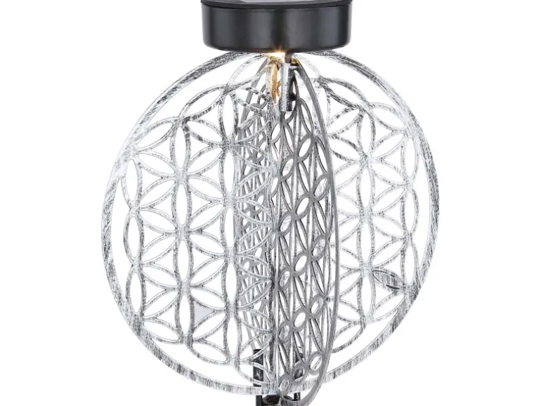 Diese Globo LED-Solaraußenleuchte mit Erdspieß aus silberfarbenem Metall (Schutzgrad IP44) ist eine schöne Ergänzung zu Ihren Außenbereich. Mittels der Erdspießen kann die Solaraußenleuchte unkompliziert und flexibel in weichen Untergrund platziert werden. Das angenehm warmweiße Licht (3000 Kelvin) des solarbetriebenem LED-Leuchtmittel scheint von oben auf die zwei verhakten Metallplatten mit wunderschönen Muster. Die 2 flachen, runden Scheiben beinhalte das Muster der Lebensblume.