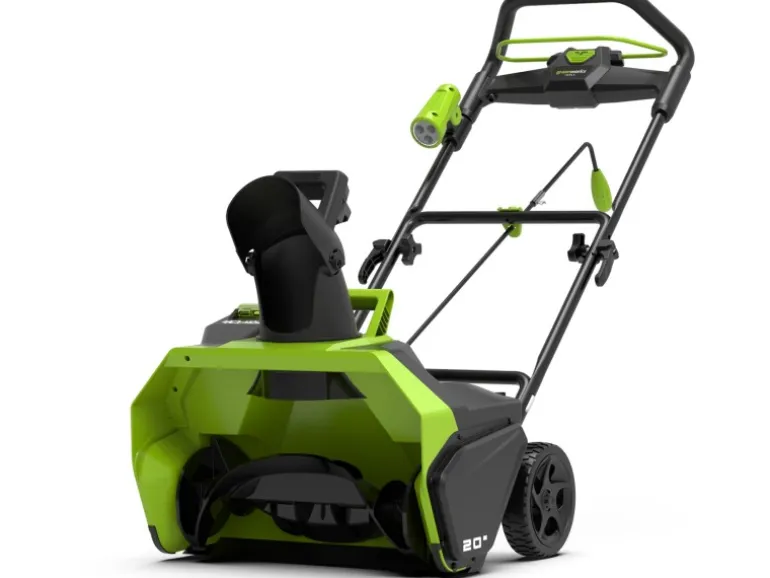 Das Gerät verfügt über große Räder für den einfachen Transport und ein integriertes LED-Arbeitslicht für dunkle Wintertage. Nach erledigter Arbeit können die Griffe vollständig zusammengeklappt werden, um sie einfach in der Garage oder im Schuppen aufzubewahren.