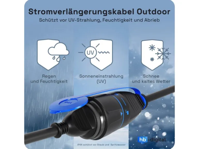 Für maximale Sicherheit ist das Stromkabel für den Außenbereich mit einem CEE 7/7 Sicherheitsstecker und einer CEE 7/3 Sicherheitssteckdose ausgestattet. Die Steckdose verfügt über eine Schutzvorrichtung (Safety Shutter) und ist bis zu 12 kg Kraftaufwand verriegelbar, um unbeabsichtigtes Trennen zu verhindern.