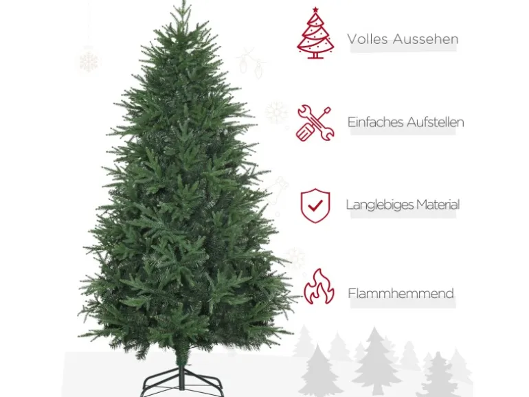 Mit diesem realistischen Weihnachtsbaum vom HOMCOM bringen Sie eine festliche Weihnachtsstimmung nach Hause – jedes Jahr aufs Neue! Diese Kunsttanne lässt sich schnell aufbauen und besticht durch eine volle, üppige Form. Die robusten Zweige halten all Ihren Lieblingsbaumschmuck, ohne dabei zu nadeln. Außerdem lässt sich dieser Baum oft wiederverwenden, sodass Sie keine lebendigen Tannen mehr fällen lassen müssen und das Weihnachtsfest in vollen Zügen genießen können.