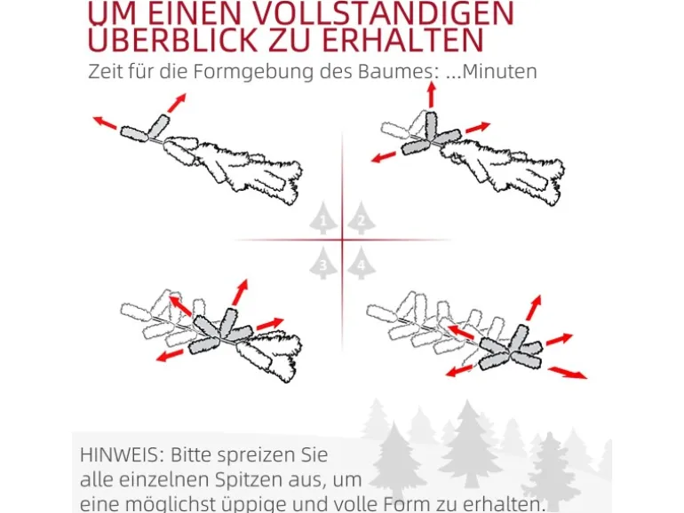 2, Um ein volles Erscheinungsbild zu erhalten, bitte alle einzelnen Spitzen ausbreiten, um das bestmögliche Aussehen des Baumes zu erzielen. Es wird empfohlen, etwa 20-25 Minuten für das Formen des Baumes einzuplanen