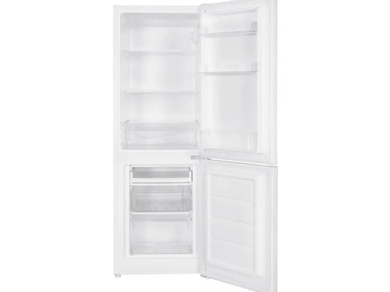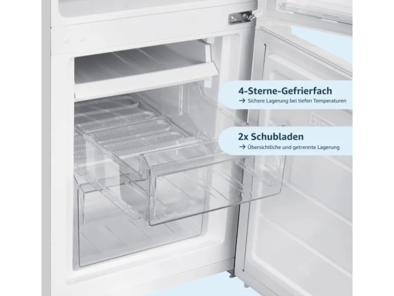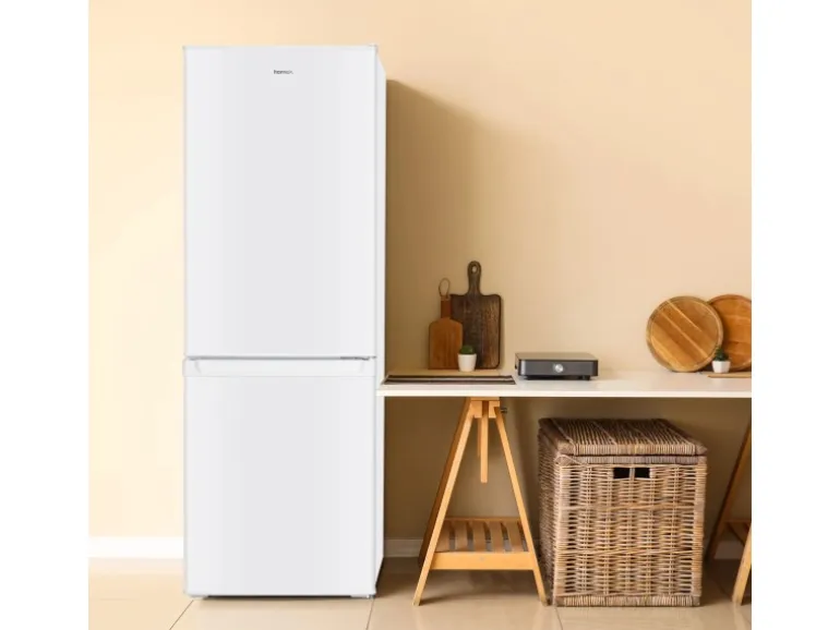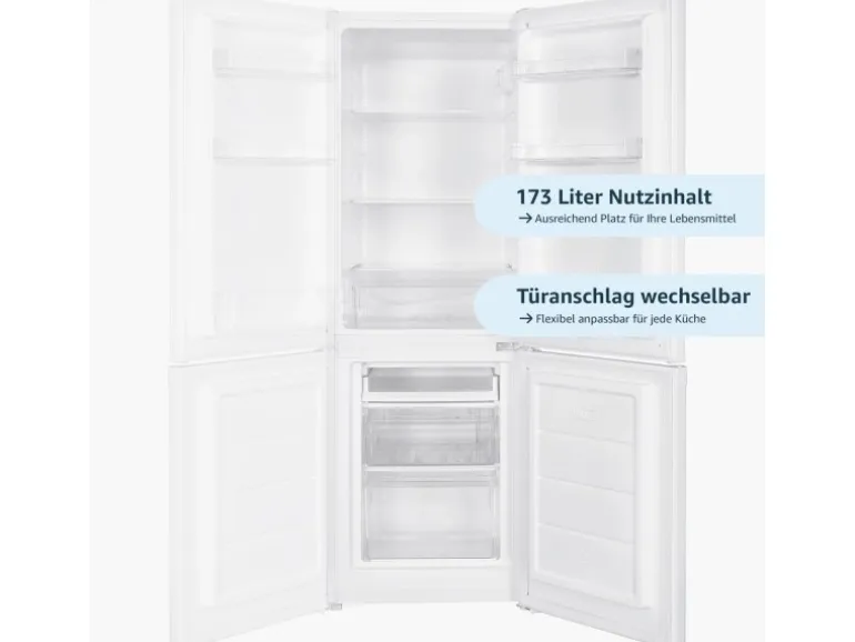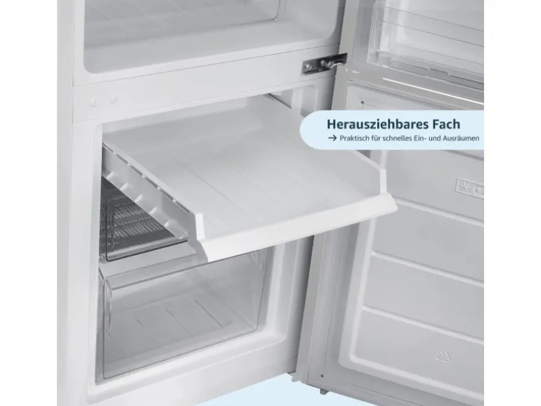Mehr Frische, mehr Ordnung, mehr Flexibilität – die homeX Kühlgefrierkombination ist die ideale Lösung für Familien und Haushalte mit hohem Bedarf. Mit seinem großzügigen Fassungsvermögen von 173 Litern (121 Liter Kühlteil + 52 Liter Gefrierteil) bietet der freistehende Kühlschrank mit Gefrierfach ausreichend Platz für all Ihre Lebensmittel.Dank der LED-Beleuchtung behalten Sie stets den Überblick, während die präzise Temperaturregelung für ideale Frische sorgt.Die clevere Innenraumaufteilung sorgt für optimale Organisation:3 flexibel verstellbare Glasabstellflächen sorgen für vielseitige Aufbewahrung 1 geräumige Gemüseschublade hält Obst und Gemüse knackig frisch Praktische Türablagen: 2 normale Ablagen und 1 große Türablage für größere Flaschen 4-Sterne-Gefrierfach mit einem herausziehbaren Fach und 2 zusätzlichen Schubladen für TiefkühlwarenMit höhenverstellbaren Füßen und einem wechselbaren Türanschlag passt sich das Gerät perfekt an Ihre Küche an – egal, ob moderne Einbauküche oder klassisches Design.Technische Details:Energieeffizienzklasse: C – für geringen Stromverbrauch Maße (BxTxH): 49,5 x 56,0 x 142,5 cm – kompakt und platzsparend Lautstärke: 40 dB – angenehm leise im Betrieb Luftschallemissionsklasse: C Gewicht: 42 kg Jährlicher Energieverbrauch: 124 kWh Gefriervermögen: 2,6 kg/24h Klimaklasse: N/ST (16 – 38°C)Erleben Sie die perfekte Kombination aus Funktionalität, Flexibilität und modernem Design – die ideale Wahl für jede Küche!