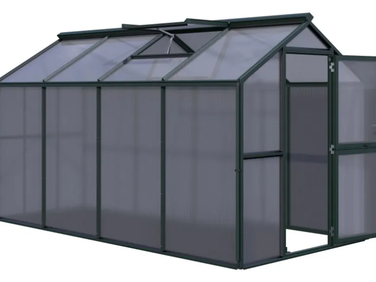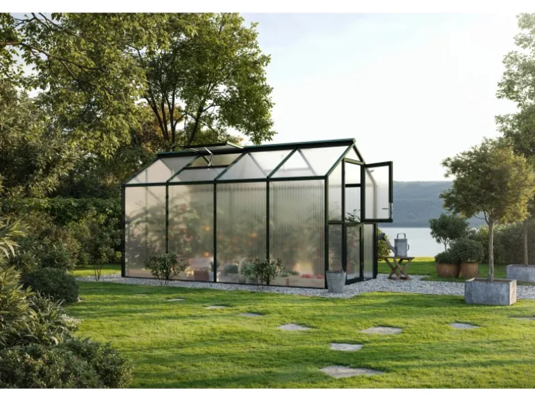 Die Eindeckung trägt im Zusammenspiel mit dem Rahmen aus unbehandeltem Polycarbonat in trendigem Tannengrün zur exzellenten Wärmedämmung des Gewächshauses bei. Der Aufbau ist dank des Steck- & Schraubsystems sehr einfach und schnell erledigt. Das Satteldach bietet eine klassische und zeitlose Optik sowie gute Belüftungs- und Entwässerungseigenschaften. Die 2 Regenrinnen sorgen zudem für einen guten Ablauf des Regenwassers.