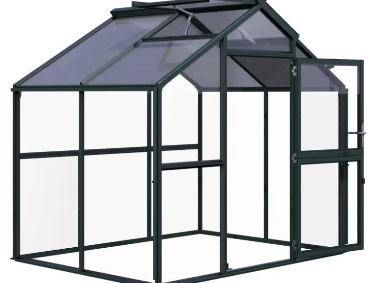 Die 10 mm starken UV-beständigen Hohlkammerplatten bieten eine hervorragende Isolierung, die das Gewächshaus im Winter warm hält und im Sommer vor Überhitzung schützt. Zudem sind sie leicht und einfach zu installieren, bruchsicher und lichtdurchlässig, was für das Pflanzenwachstum entscheidend ist. Das Satteldach bietet eine klassische und zeitlose Optik sowie gute Belüftungs- und Entwässerungseigenschaften. Die 2 Regenrinnen sorgen zudem für einen guten Ablauf des Regenwassers.