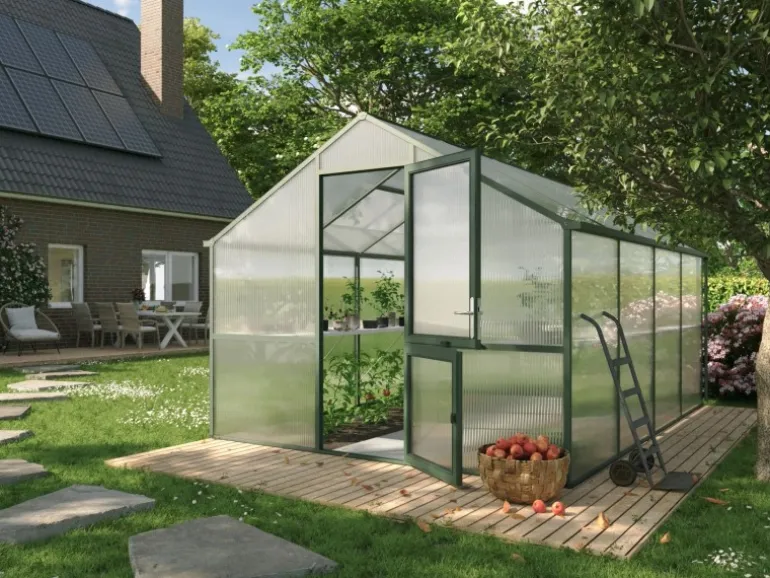 Die 16 mm starken UV-beständigen Doppelstegplatten bieten eine hervorragende Isolierung, die das Gewächshaus im Winter warm hält und im Sommer vor Überhitzung schützt. Zudem sind sie leicht und einfach zu installieren, bruchsicher und lichtdurchlässig, was für das Pflanzenwachstum entscheidend ist.