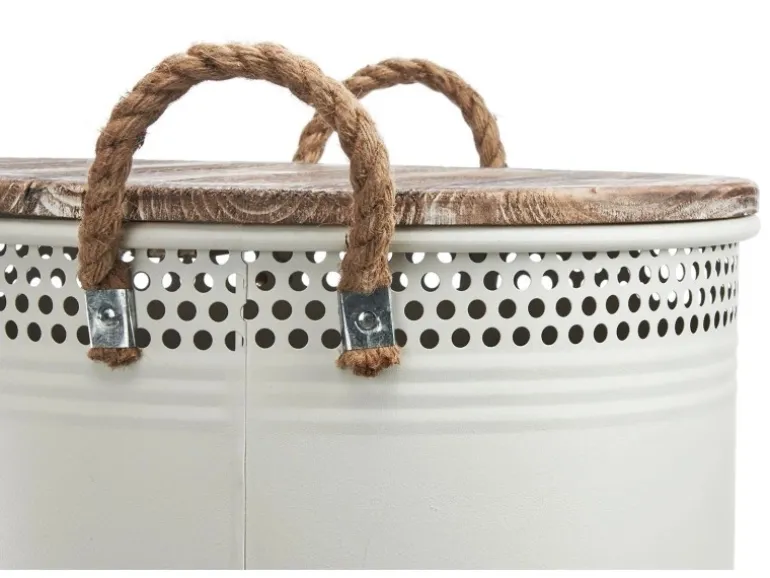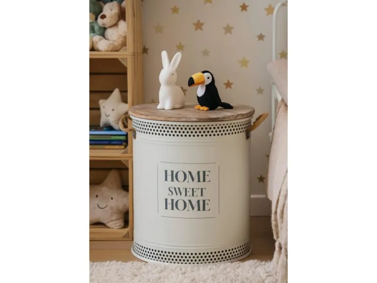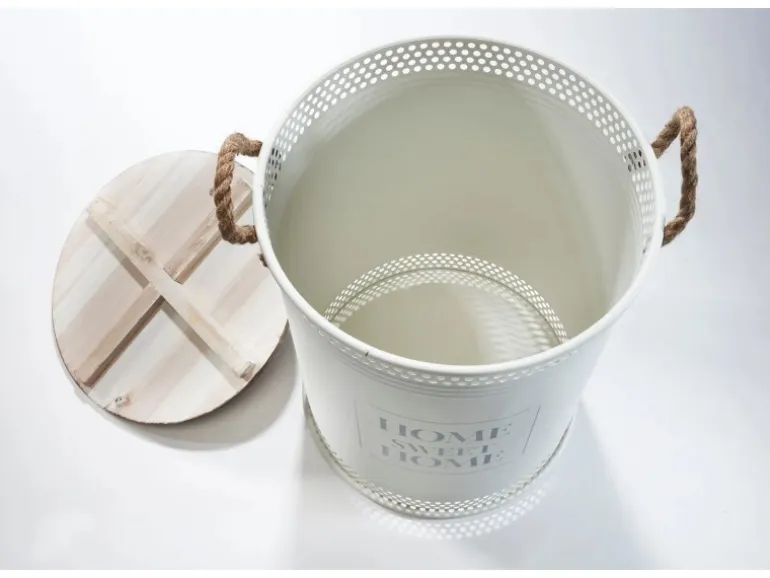 Beiger Metallkorb mit Holzdeckel und Henkel Aufdruck dekorativ und funktional