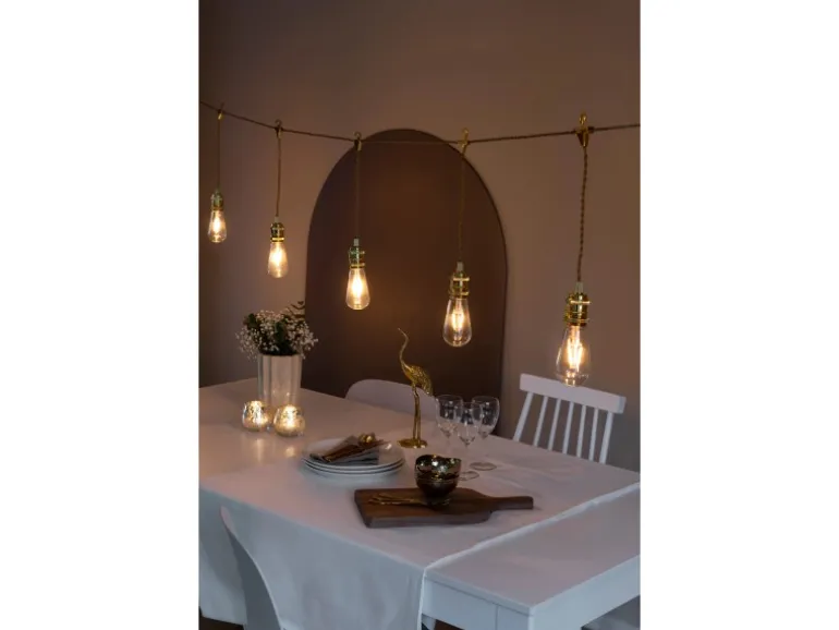 Die LED-Party-Lichterkette sorgt mit ihren birnenförmigen Lichtquellen im Retro-Design für stimmungsvolle Beleuchtung in der dunklen Jahreszeit. Sie ist mit 8 bernsteinfarbenen LED-Leuchtmittel ausgestattet und eignet sich für den Einsatz im Innenbereich. Die Energieversorgung erfolgt mittels Trafo. Dank 5 m langen, goldfarbenen Zuleitung kann die Lichterkette ganz flexibel platziert werden.