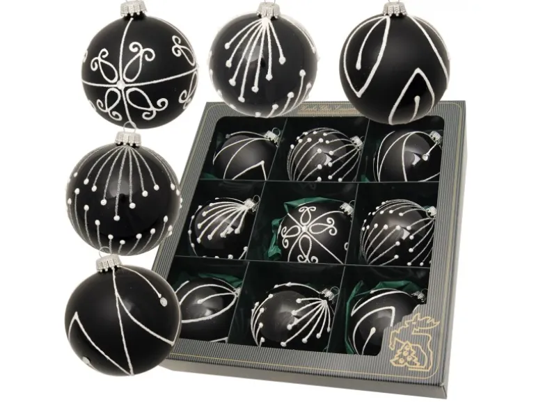 Tauche ein in die magische Welt von Weihnachten mit unserem exklusiven Glaskugelset Black & White Xmas! Die 9-teilige Kollektion besticht durch ihre Eleganz und Raffinesse. Jede Kugel ist in edlem Schwarz mit filigramen Weiß-Glitter-Dekor gehalten, sowohl in mattem als auch glänzendem Finish. Mit einem Durchmesser von 8cm sind sie perfekt geeignet, um deinen Weihnachtsbaum in ein stilvolles Meisterwerk zu verwandeln. Jede Glaskugel wurde sorgfältig mundgeblasen und handdekoriert, was ihnen eine einzigartige Note verleiht. Das Glasornament Set eignet sich nicht nur als Christbaumschmuck, sondern auch als edler Baumschmuck für jeden Anlass. Erwecke mit diesem hochwertigen Sortiment die Festtagsstimmung in dir und deinem Zuhause! Gönn dir dieses exklusive Set und mach dein Weihnachtsfest zu etwas ganz Besonderem. Freue dich auf strahlende Augen und bewundernde Blicke – denn mit dem Glaskugelset Black & White Xmas wird deine Weihnachtsdekoration zum absoluten Highlight!Lass dich verzaubern und tauche ein in die festliche Atmosphäre mit unseren Glasornamenten aus echtem Glas. Hol sie dir jetzt und erlebe unvergessliche Weihnachtsmomente!