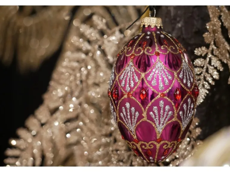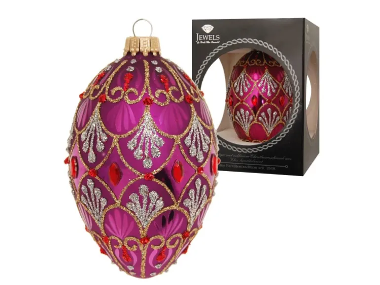 Mit dem Glanz & Gloria Weihnachtsbaumschmuck von Jewels by Krebs Glas Lauscha setzt Sie auf hochwertiges, mundgeblasenes Glas in einem satten Magenta-Ton mit einer edlen Goldverzierung und funkelnden roten Strasssteinen. Jedes einzelne 10 cm große Glas-Ei ist aufwendig dekoriert und erinnert mit seinen Kristallen im Swarovski Style an das Erbe von Fabergé. Dieser Weihnachtsbaumschmuck ist ein echter Hingucker und wird garantiert alle Blicke auf sich ziehen. Der Glanz & Gloria Schmuck ist nicht nur einzigartig und besonders hochwertig, er ist auch langlebig und wird Sie viele Weihnachtsfeste begleiten. Mit dem Glanz & Gloria Schmuck von Jewels by Krebs Glas Lauscha holst du dir ein Stück Weihnachtszauber in dein Zuhause. Vertraue auf die Erfahrung und Expertise eines traditionsreichen Herstellers und lasse dich von der Schönheit dieses Weihnachtsbaumschmucks verzaubern.