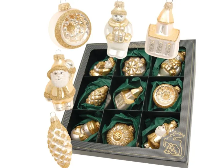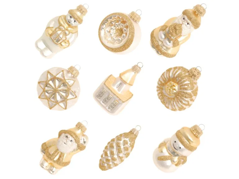 Unser exklusives Formen & Figuren Sortiment Gold ist die perfekte Wahl, um Ihren Weihnachtsbaum in diesem Jahr besonders edel und glamourös erstrahlen zu lassen. Die handdekorierten Ornamente sind zwischen 6-8 cm groß und bestehen aus echtem Glas, was für eine hochwertige Optik und Haltbarkeit sorgt. Das Set besteht aus insgesamt 9 Teilen, darunter verschiedene Formen wie Weihnachtsmann, Schnemann, Kirche und Zapfen. Jedes Stück ist mundgeblasen und mit funkelndem Gold Glitter dekoriert, was für einen festlichen Glanz sorgt. Diese einzigartigen Baumschmuckstücke werden garantiert alle Blicke auf sich ziehen und Ihrem Weihnachtsbaum eine luxuriöse Note verleihen. Mit unserem Formen & Figuren Sortiment Gold wird Ihr Zuhause in der Weihnachtszeit zu einem wahren Blickfang. Gönnen Sie sich diesen extravaganten Schmuck und tauchen Sie ein in die festliche Atmosphäre. Jetzt erhältlich – sichern Sie sich dieses exklusive Set noch heute!