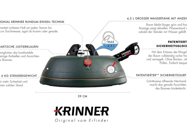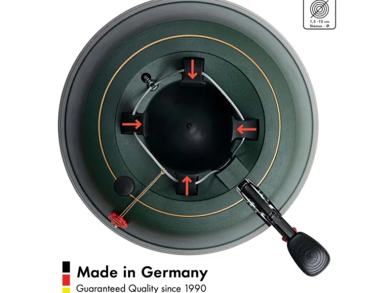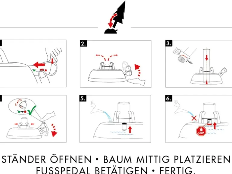 Die durchgehende Seilführung der original Rundum-Einseil-Technik garantiert dabei den gleichmäßigen Druck der Klauen an den Stamm. Einfach den Baum in den Ständer stellen, das Fußpedal treten, und schon ist der Baum aufgestellt. Ob dick, dünn oder krumm gewachsen, der Baum steht immer sicher und kerzengerade. Die patentierte Sicherungsglocke im Fußpedal signalisiert gut hörbar, wenn die Klauen sicher und fest am Baum anliegen und der Verschluss des Fußhebels automatisch eingerastet ist.