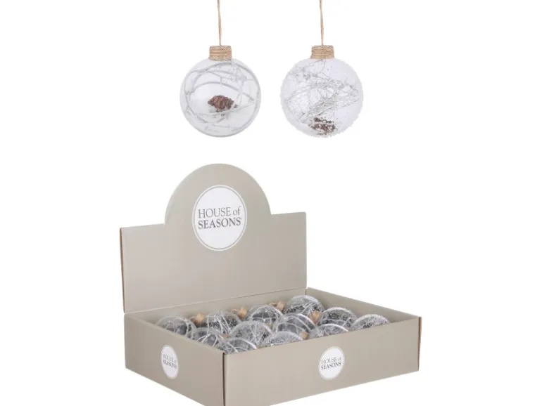 Entscheiden Sie sich dieses Jahr für die Natur und wählen Sie diese besonderen Kugeln von House of Seasons für Ihren Baum. Das Set besteht aus zwei Kugeln aus transparentem Glas. Im Inneren befindet sich ein Tannenzapfen mit weißen Zweigen auf einer Schneedecke. Wie eine Szene aus einem Winterwald! Die Kugeln sind beide leicht unterschiedlich und haben einen Durchmesser von 8 cm. Durch ihr neutrales Aussehen lassen sie sich gut mit anderen Weihnachtsdekorationen kombinieren.