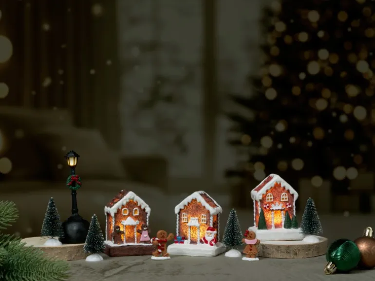 Mehrteiliges, teilweise beleuchtetes Weihnachtsdorf mit verspieltem Lebkuchen-Design