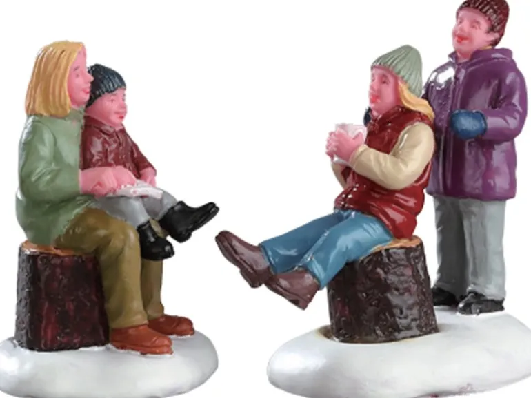 Die Lemax Weihnachtsdekoration 2er-Set Mutter Kind Zeit ist eine Performance einer Mutter mit drei Kindern. Mutter sitzt mit einem Kind auf dem Schoß auf einem Baumstamm.