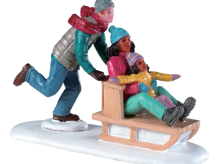 Die Lemax Weihnachtsdekoration Familientag im Schnee zeigt einen Vater mit zwei Kindern und einem Schlitten im Schnee. Die Kinder sitzen auf dem Schlitten und der Vater schiebt.