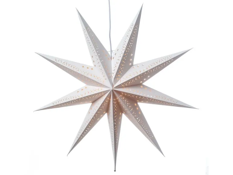 Der Papierstern hat 9 Zacken und wird flach geliefert. Durch ein Aufdrehen des Sterns entfaltet er sich und die Fassung kann eingeführt werden. Je nachdem welches Leuchtmittel Du einsetzt, kannst Du in Lichtfarbe und Helligkeit wählen.