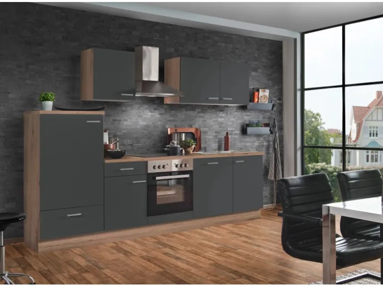 Moderne Küche in eleganter Optik mit Fronten in Graphit und Korpus aus Artisan-Eiche Nachbildung