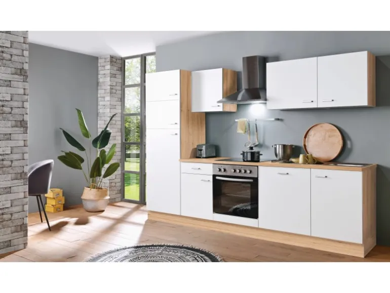 Moderne Küche in eleganter Optik mit Fronten in Weiß und Korpus aus Artisan-Eiche Nachbildung