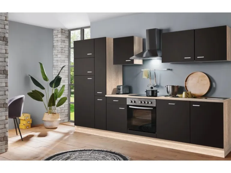 Moderne Küche in eleganter Optik mit Fronten in mattem Lava und Korpus aus Sonoma-Eiche Nachbildung