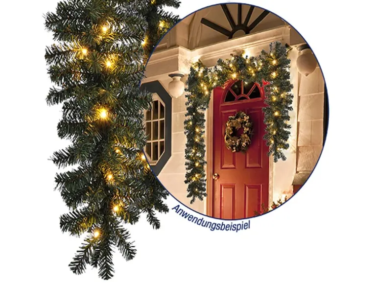 Tannengirlande 2 70 m Beleuchtet mit 35 warmweissen LEDs Weihnachtsdekoration fuer innen und aussenBringen Sie festliche Stimmung in Ihr Zuhause oder Ihren Aussenbereich mit dieser taeuschend echten Tannengirlande. Die 2 70 m lange Weihnachtsgirlande ist mit 35 energiesparenden LEDs in warmweiss ausgestattet und sorgt fuer ein gemuetliches festliches Ambiente perfekt fuer Balkone Gaerten Haustueren Gelaender Fenster oder Marktstaende.Dank der biegsamen Form laesst sich die Girlande flexibel dekorieren ob gewickelt um Treppengelaender als Tuerrrahmenschmuck oder als Tischdekoration. Die batteriebetriebene LED Lichterkette ermoeglicht kabellosen Einsatz ueberall dort wo Sie weihnachtliche Akzente setzen moechten.ProduktmerkmaleTaeuschend echte Tannengirlande aus hochwertigem KunststoffLaenge 270 cmDurchmesser ca 18 cmBeleuchtung 35 warmweisse LEDs fuer stimmungsvolles LichtBatteriebetrieben 2 x AA nicht enthalten flexibel platzierbarFuer Innen und Aussen geeignet wetterfest und langlebigEnergiesparend moderne LED Technik mit geringem VerbrauchLeicht formbar ideal zum Umwickeln Drapieren und AufhaengenMit dieser beleuchteten Tannengirlande zaubern Sie im Handumdrehen festliche Weihnachtsstimmung egal ob im Haus auf der Terrasse oder im SchaufensterTipp Kombinieren Sie mehrere Girlanden fuer eine noch eindrucksvollere Weihnachtsdekoration