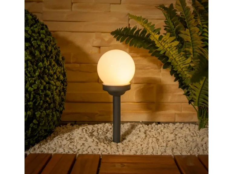 Mit dem Näve LED-Kugelerdspiess 6er-Set setzen Sie leuchtende Akzente in Ihrem Garten, der Terrasse oder Ihrem Balkon. Diese Solarleuchten strahlen in einem angenehmen, warmweißen Licht. Die Leuchten haben eine Höhe von 34 cm und einen Durchmesser von 10 cm. Über die Sonnenstrahlung lädt das Solarmodul den Akku auf. Bei Einbruch der Dunkelheit schalten sich die LEDs automatisch ein. Die LED Solar-Erdspieße sorgen für gemütliche Abendstunden in Ihrem Garten. Die Lampe weist die Schutzklasse IP44 auf.