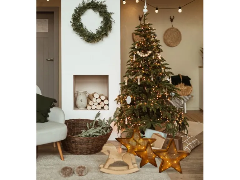3er-Set LED-Deko-Weihnachtssterne braun – der ultimative Blickfang für die Weihnachtszeit Weihnachtslichter gehören einfach zur festlichen Jahreszeit und schaffen eine unvergleichliche Atmosphäre voller Wärme und Glanz. Mit unseren beleuchteten Weihnachtsartikeln bringen Sie diese Magie direkt in Ihr Zuhause. Ob leuchtende Sterne, funkelnde Kugeln oder strahlende Figuren – jede Dekoration sorgt für ein stimmungsvolles Ambiente und macht Ihr Zuhause zu einem festlichen Blickfang. Lassen Sie sich von der Vielfalt und dem Lichterglanz inspirieren und zaubern Sie unvergessliche Weihnachtsmomente! 3er-Set LED-Deko-Weihnachtssterne braun im Landhaus Stil – sternförmig und sehr rustikal. Die braune Weihnachtsdeko aus Metall, Kunststoff und Textilmaterial ist ein wunderbares Accessoire und verwandelt jeden Raum. Dieser Artikel hat eine Größe von 50 (Länge) x 10 cm (Breite) x 48 cm (Höhe). Der Weihnachtsartikel ist mit 58 energieeffizienten LED-Leuchtmittel ausgestattet, was eine langlebige und energieeffiziente Beleuchtung garantiet. Mit 4 Watt Leistung leuchtet der Artikel 40 Lumen hell und hat eine Farbtemperatur von 3000 Kelvin. Der Stripe wird über einen Netzanschluss betrieben, das heißt er benötigt eine normale Steckdose. Dieser Artikel ist mit einem Euro-Flachstecker ausgestattet. Dieses Produkt ist eine Klasse 3 nach IP44-Norm.