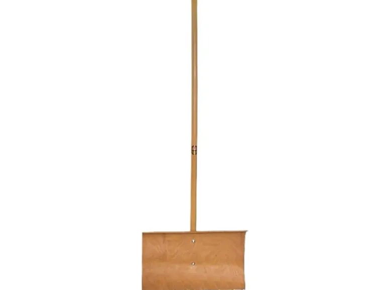 Das Schieberblatt ist aus 5-fach-verleimtem Sperrholz und wird mit dem Stiel durch 2 Schrauben mit Flügelmuttern befestigt. Der ovale und gebogene Hartholzstiel lässt den Schieber beim Schneeräumen angenehm in der Hand liegen
