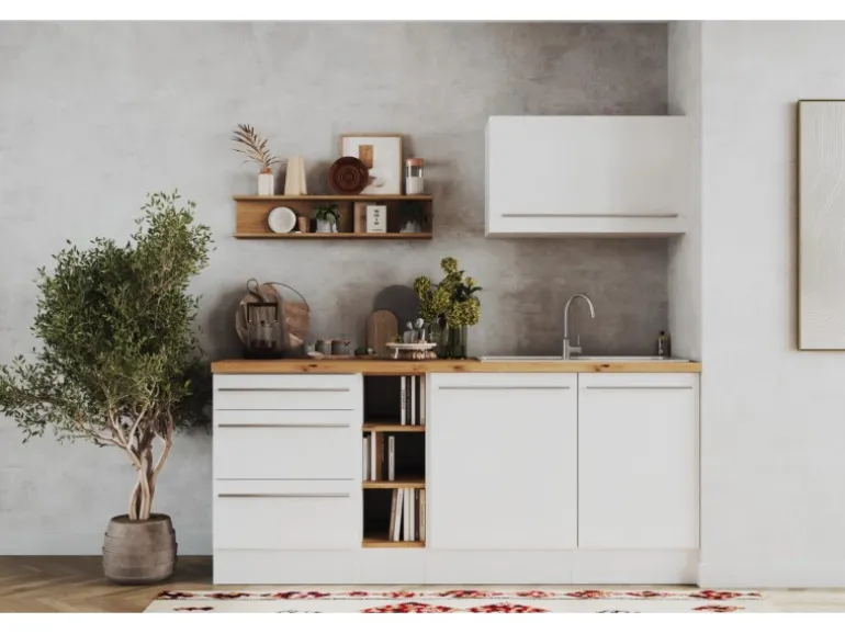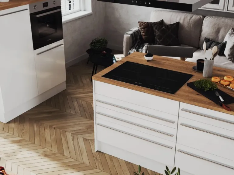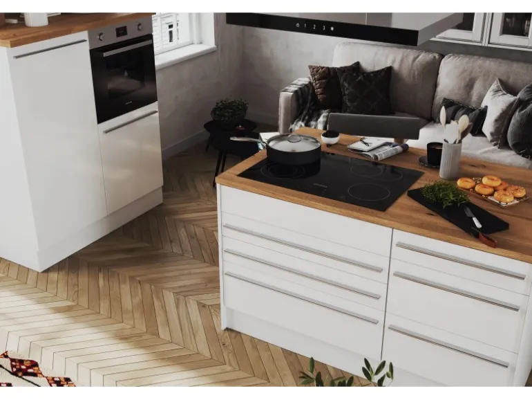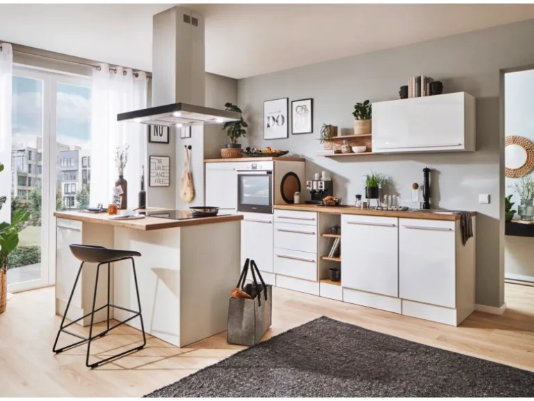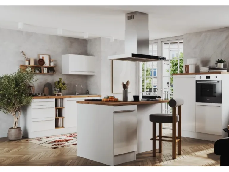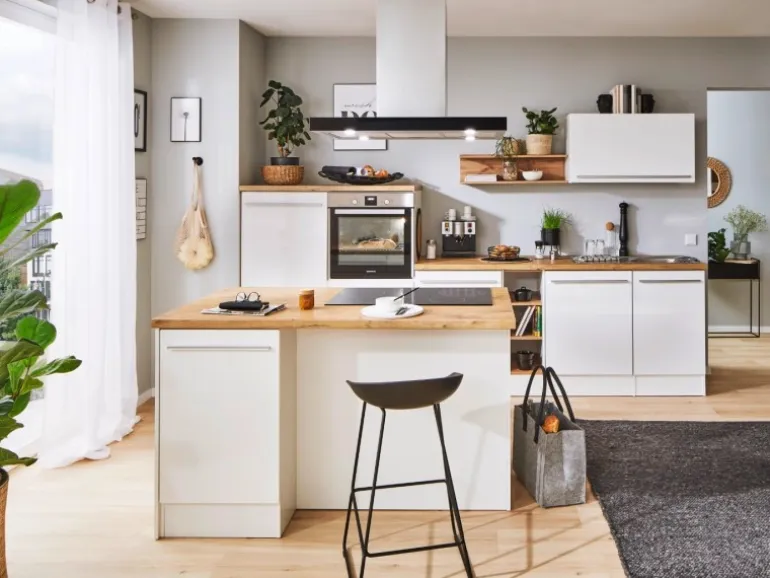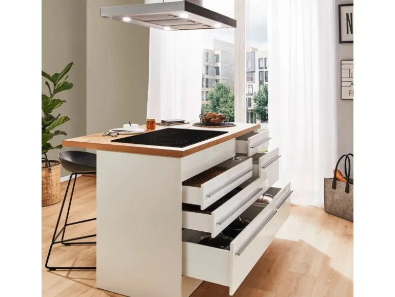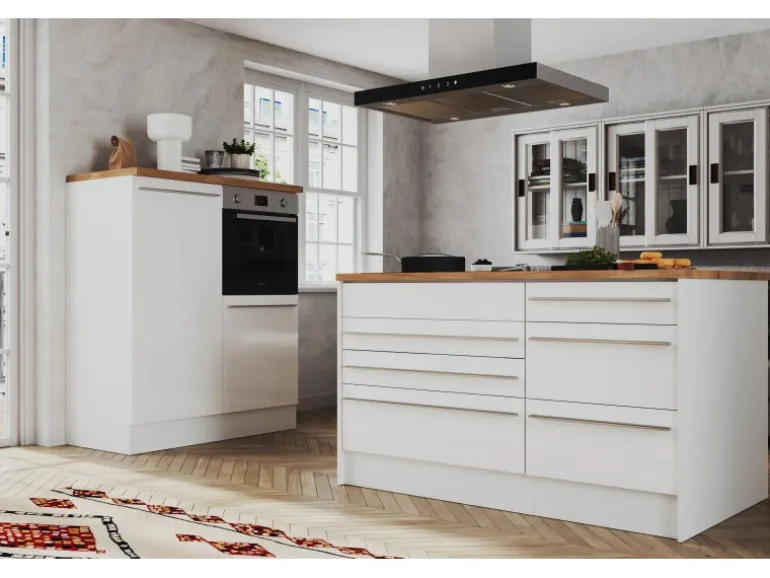 Die Gabriel Küchen Familie hat eine Erweiterung erhalten: Die Küchenzeilen mit einer Breite von 290 cm oder 320 cm sind jetzt auch mit einer Kücheninsel erhältlich. Es gibt zwei Varianten der Gabriel Inselküchen. Bei der ersten Variante sind alle Elektrogeräte in der Zeile eingebaut, während die Insel als zusätzliche Arbeitsfläche dient. Die zweite Variante verfügt über eine Insel, die mit einem autarken Backofenset und einer Inselhaube ausgestattet ist. Dieses Set besteht aus einem Backofen und einem Induktionskochfeld, das je nach Küchengröße in einer Breite von 59 cm oder 77 cm erhältlich ist. Zusätzlich gibt es eine Inselküche, bei der eine Kochfeldhaube in die Insel installiert ist. Unabhängig von der Variante kann die Insel wechselseitig aufgebaut werden. Sie lässt sich je nach Bedarf mit der einen oder anderen Seite nach vorne ausrichten, was eine individuelle Anpassung an den jeweiligen Küchenraum ermöglicht. Die Zeile kann zudem als Doppelblock montiert werden, was zusätzliche Flexibilität bei der Küchenplanung bietet. Die Gabriel Küchen Familie ist mit Soft-Close Scharnieren ausgestattet und bietet höchsten Bedienkomfort sowie eine lange Lebensdauer.