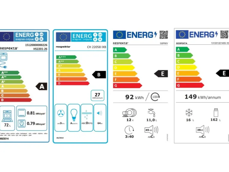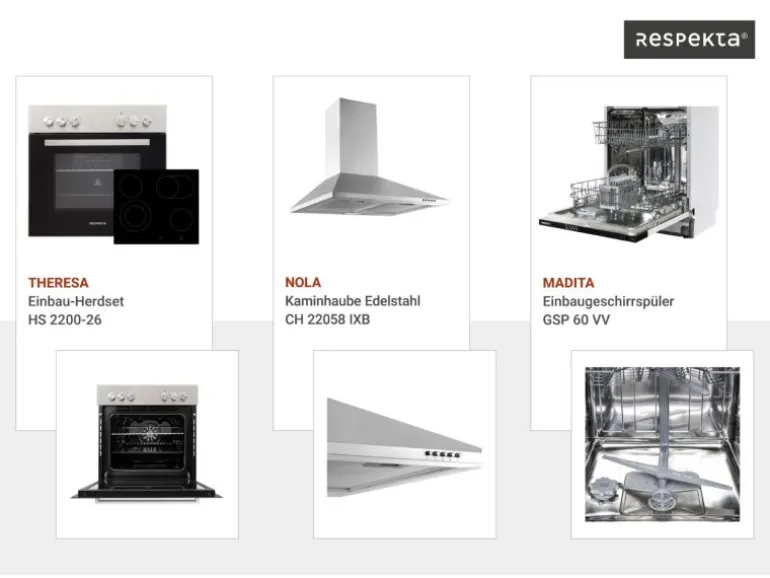 Mit Einbaubackofen EEK: A und Glaskeramikkochfeld, Kaminhaube EEK: B, Einbaugeschirrspüler EEK: E, Einbaukühlschrank EEK: E
