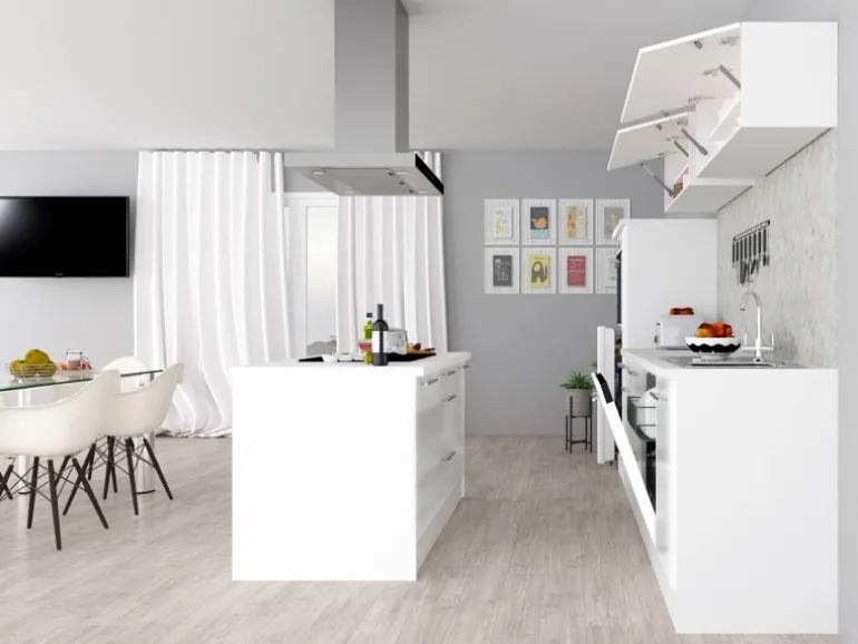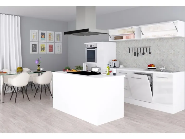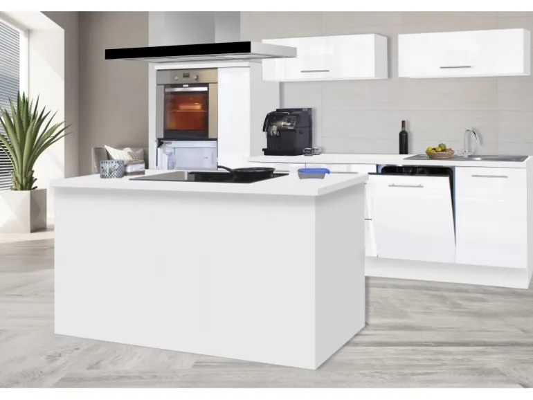 Moderne Küche mit Kochinsel und Hochglanzfronten in Weiß
