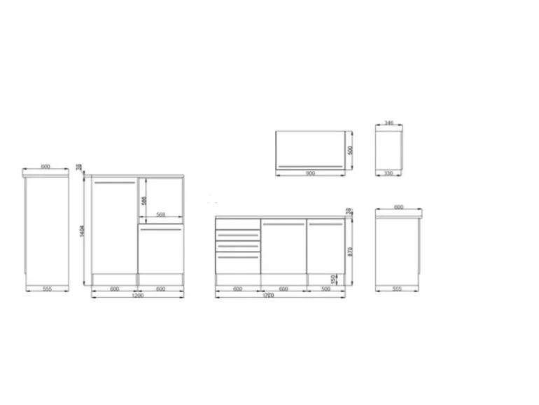 Die Respekta Küchenzeile besteht aus (H x B x T):