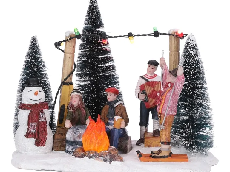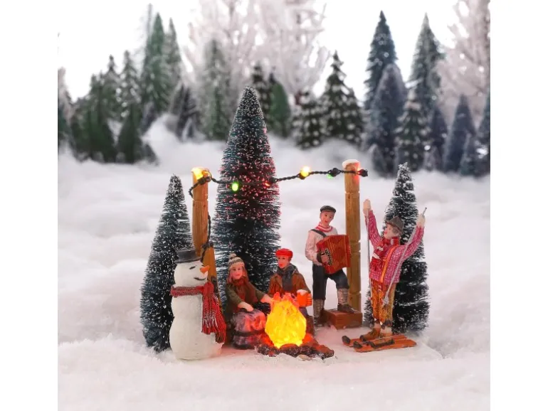 Mit dieser Pistenparty aus der Luville-Kollektion machen Sie es sich in Ihrem Weihnachtsdorf sofort gemütlich. Die Miniatur zeigt mehrere verschneite Tannenbäume, einen Schneemann, ein gemütliches Lagerfeuer und verschiedene glückliche Gäste. Die farbigen Lichter vervollständigen das Bild und die farbwechselnden Lichter im Lagerfeuer lassen es so aussehen, als würde das Feuer wirklich brennen! Die Leuchten werden mit 2 AA-Batterien betrieben (nicht im Lieferumfang enthalten), die Miniatur ist aber auch mit einem Adapteranschluss ausgestattet. Die Abmessungen sind L16 x B12 x H12,5 cm. Haben Sie noch einen Platz frei?