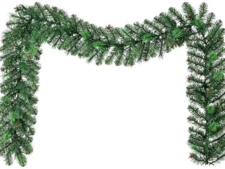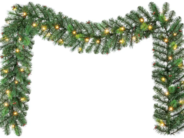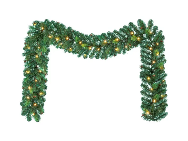 Tannengirlande mit warmweißer LED-Beleuchtung und kleinen roten Deko-Kugeln