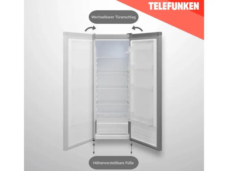 Der freistehende Standkühlschrank KTFK265EDI von Telefunken ist nicht nur funktional, sondern auch ein echter Blickfang mit seinem modernen und eleganten Design. Mit einer Vielzahl nützlicher Features wie einer präzisen Temperaturregelung und einer LED Innenbeleuchtung setzt er neue Maßstäbe in Sachen Komfort.Mit einem großzügigen Nutzinhalt von insgesamt 255 Litern bietet der Kühlschrank von Telefunken ausreichend Platz für einen Familienhaushalt. Der Kühlschrank verfügt zudem über eine praktische Abtauautomatik. Diese entfernt automatisch Eisbildung und vereinfacht die Wartung.Fünf robuste verstellbare Glasabstellfächer, eine Frischhalteschublade für Gemüse und vier Türablagen sorgen außerdem für eine optimale Organisation.Der Telefunken Kühlschrank passt sich mühelos in jede Küche ein, dank des wechselbaren Türanschlags und der höhenverstellbaren Füße. Mit einer Schallbelastung von nur 41 dB (A) gehört lästiges Brummen der Vergangenheit an. Genießen Sie eine angenehme und nutzerfreundliche Umgebung in Ihrer Küche, ohne störenden Lärm.
