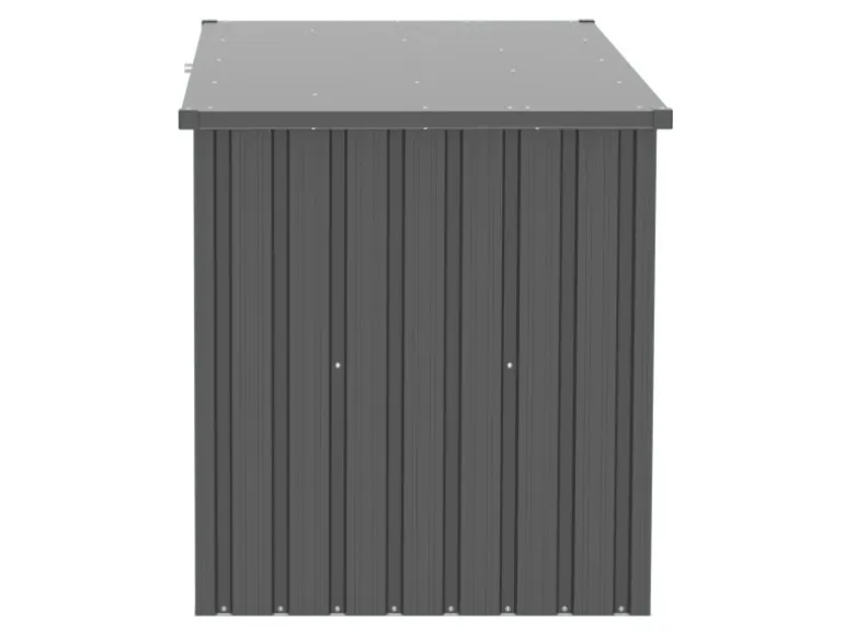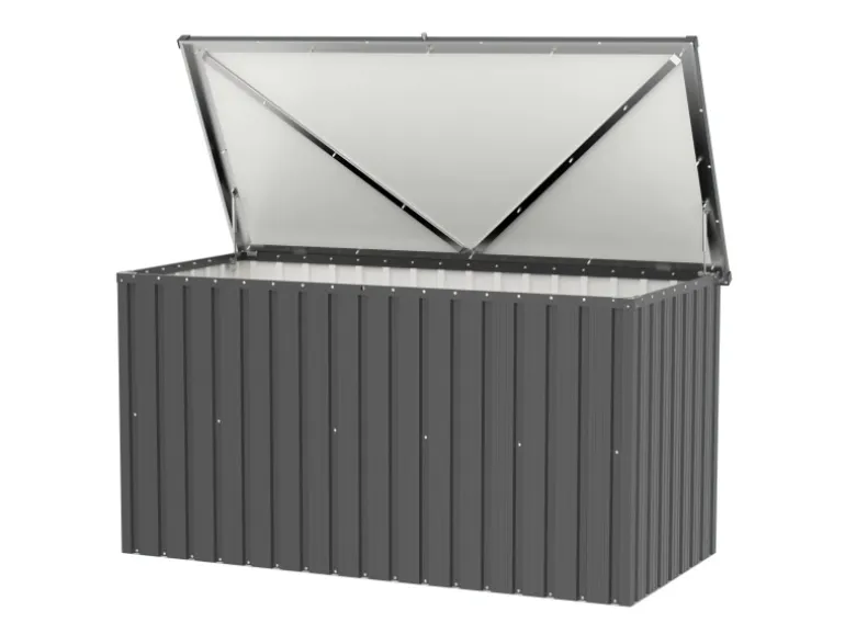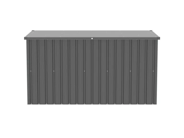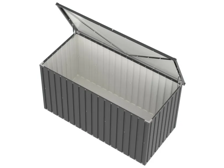 Hergestellt aus verzinktem Stahlblech, ist die Box äußerst langlebig und praktisch wartungsfrei. Die spezielle Pulverbeschichtung schützt sie vor Zersetzung durch langfristige Niederschläge. Der leichtgängige, aufklappbare Deckel mit zwei Gasdruckfedern erleichtert das Verstauen von Gegenständen erheblich. Ein integriertes Schloss sorgt für zusätzliche Sicherheit und unterstreicht den praktischen Charakter der Box.