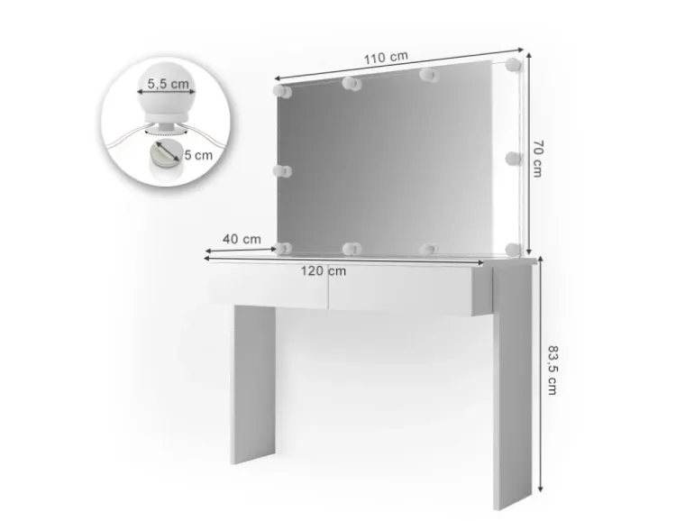 Der Schminktisch hat eine Breite von 120 cm, eine Höhe von 83,5 cm und eine Tiefe von 40 cm