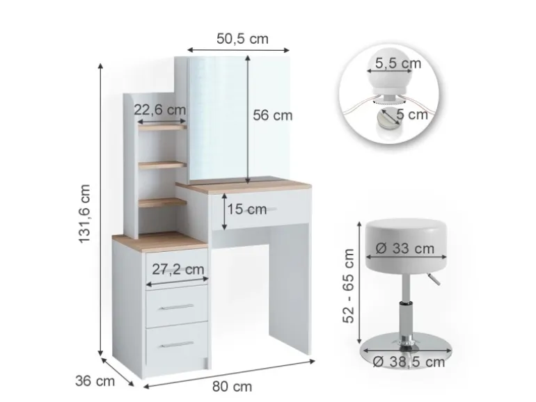Der Schminktisch hat eine Breite von 80 cm, eine Höhe von 131,6 cm und eine Tiefe von 36 cm