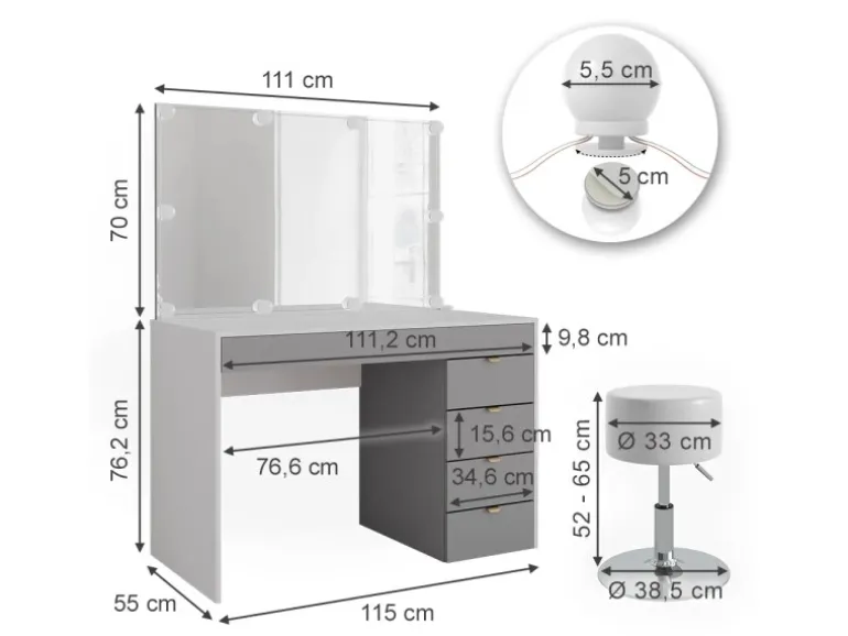 Frisiertisch: 115x76x55 cm (BxHxT), 37 kg. Spiegel: 111x70x4 cm, 13,7 kg