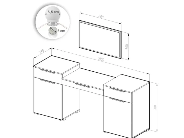 Der Schminktisch mit Spiegel ist 190 cm breit, 90 cm hoch und 39 cm tief.