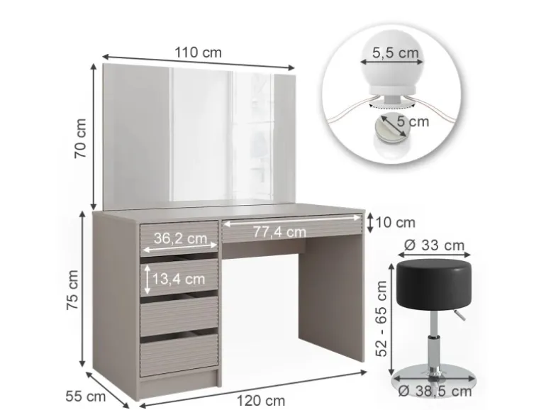 Der Schminktisch hat eine Breite von 120 cm, eine Höhe von 75 cm und eine Tiefe von 55 cm