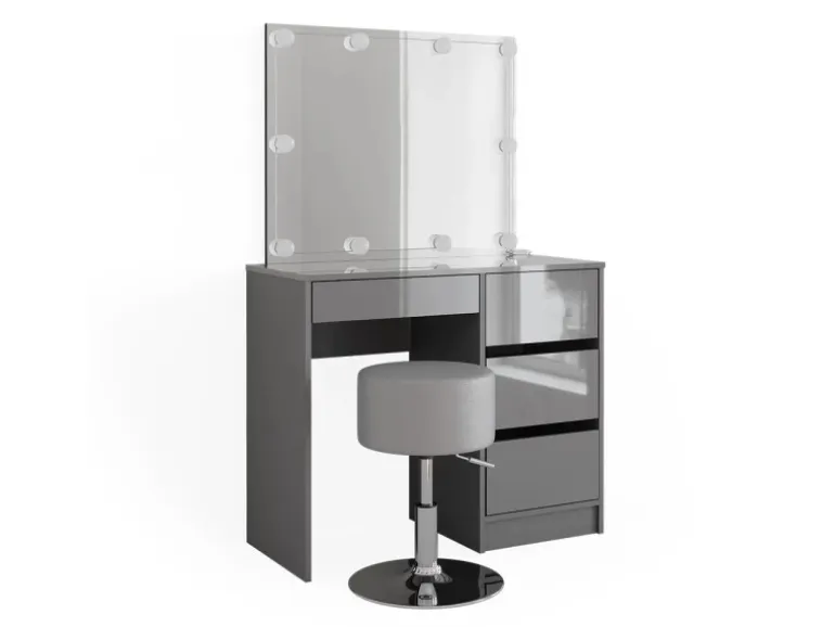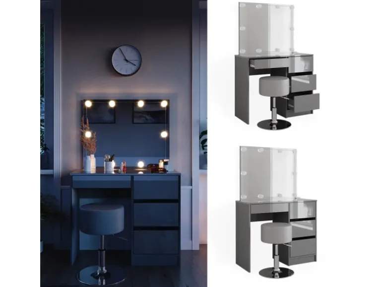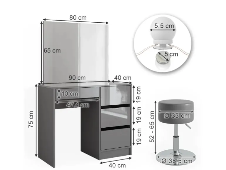 Maße des Frisiertischs: 90x75x40 cm (BxHxT). LED-Spiegel: 80x65x3 cm. Hocker: 52-67 cm (H).