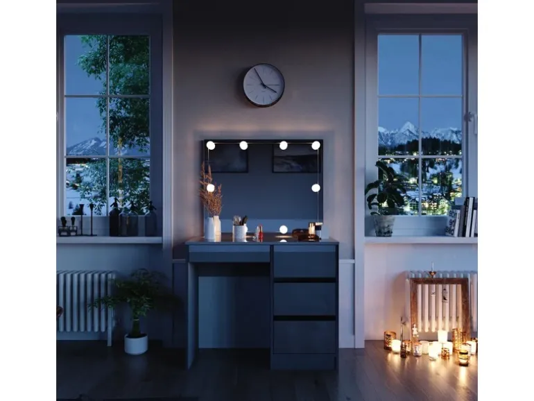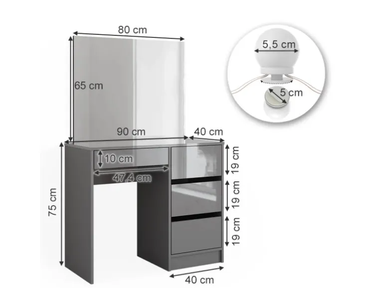 Maße des Frisiertischs: 90x75x40 cm (BxHxT). LED-Spiegel: 80x65x3 cm. Hocker: 52-67 cm (H).