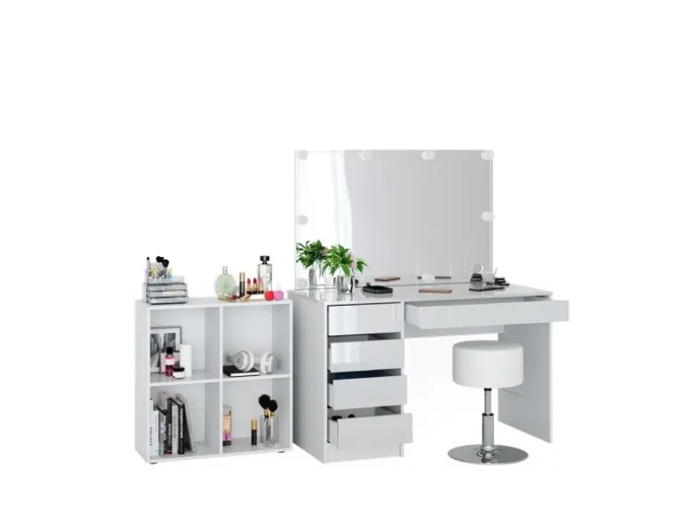 Inhalt: Schminktisch mit Spiegel, Standregal, Hocker, LED-Lichterkette, Anleitung, Montagematerial.
