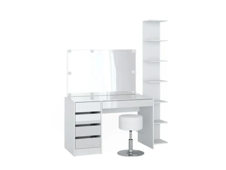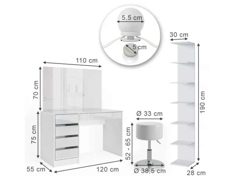 Enthalten: Schminktisch, Spiegel, Wandregal, Hocker, LED-Lichterkette, Anleitung, Montagematerial.